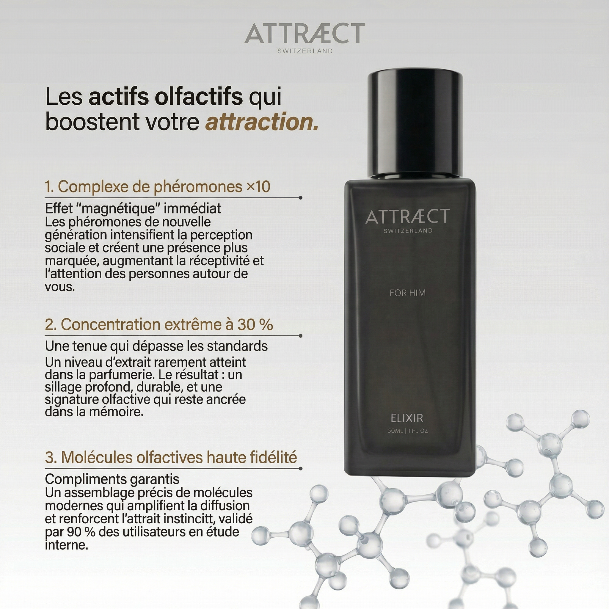 Conçu et fabriqué dans les laboratoires Suisses les plus réputés, Attraect est le fruit d'une recherche d'excellence. La précision suisse au service de votre pouvoir de séduction.